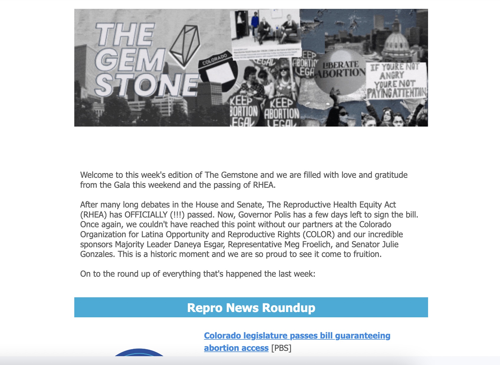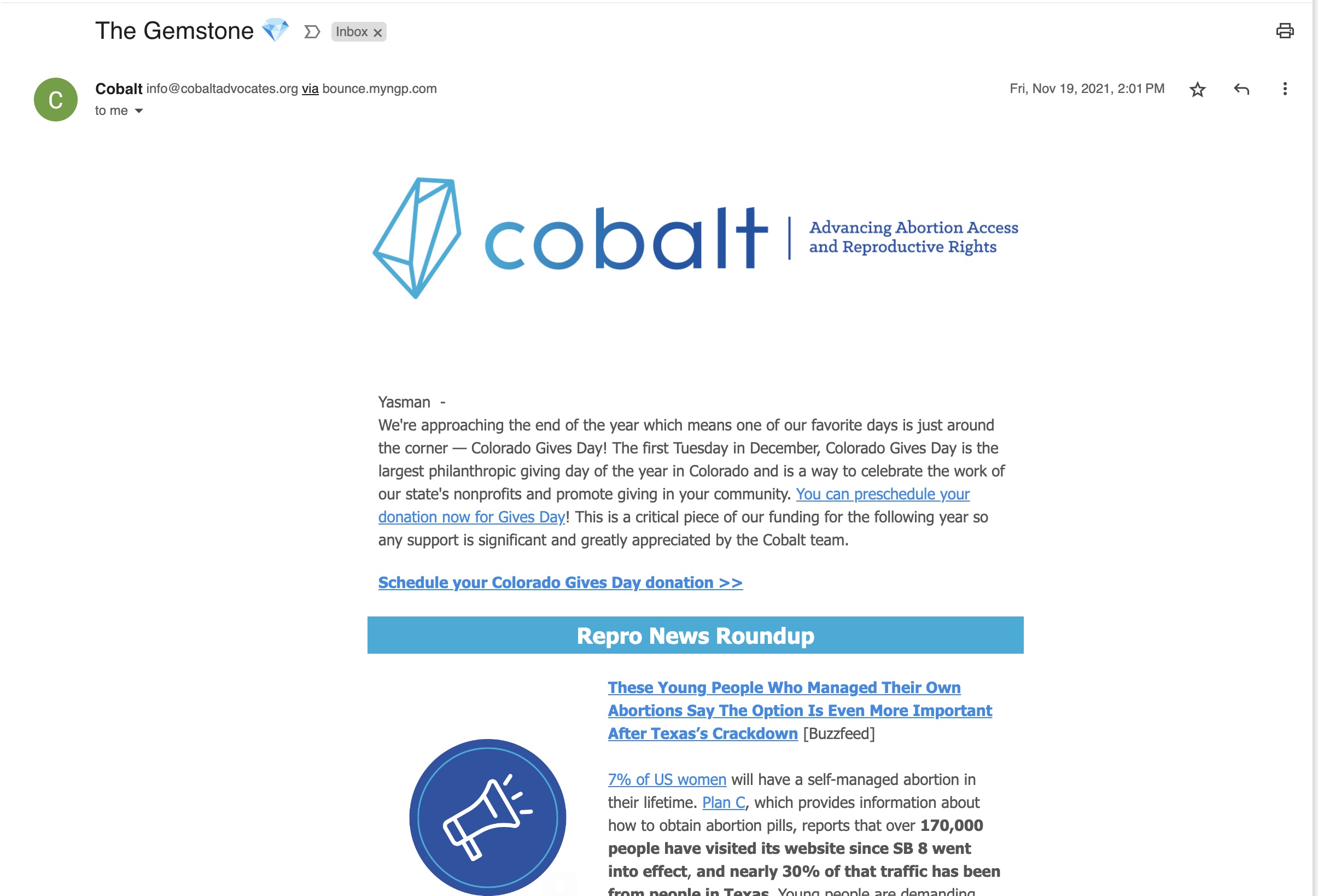 Email Marketing/Newsletters/Blogs: While majority of Cobalt’s email are created by the development team, I revived the copy and revamped the graphics for The Gemstone, which focuses on abortion news in Colorado and the rest of the US along with something positive at the end. The emails always have a focus on fundraising and volunteering. It has raised over 3k.